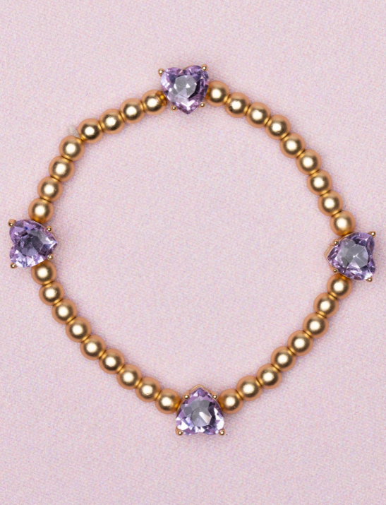 The Boutique Chic Amethyst Love Bracelet is a stylish accessory that will enhance your personal style. Its eye-catching design features gold beads and four beautiful lilac purple heart stones. The stretchy elastic design ensures a comfortable and secure fit for all wrist sizes, making it a versatile piece that is easy to wear.