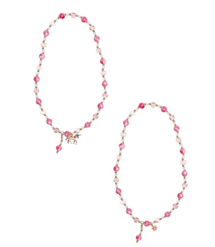 You're sure to be charmed by our Boutique Pink Crystal Necklace Assortment. This necklace set features pink and clear crystal beads, metallic accents. One necklace comes with a beautiful pink flower & the other has a magical unicorn charm. Pair it with our Boutique Pink Crystal bracelet for the perfect set .Our NEW Boutique collection boasts a meticulously curated selection of necklaces, bracelets, headbands and hair accessories to set this collection apart.