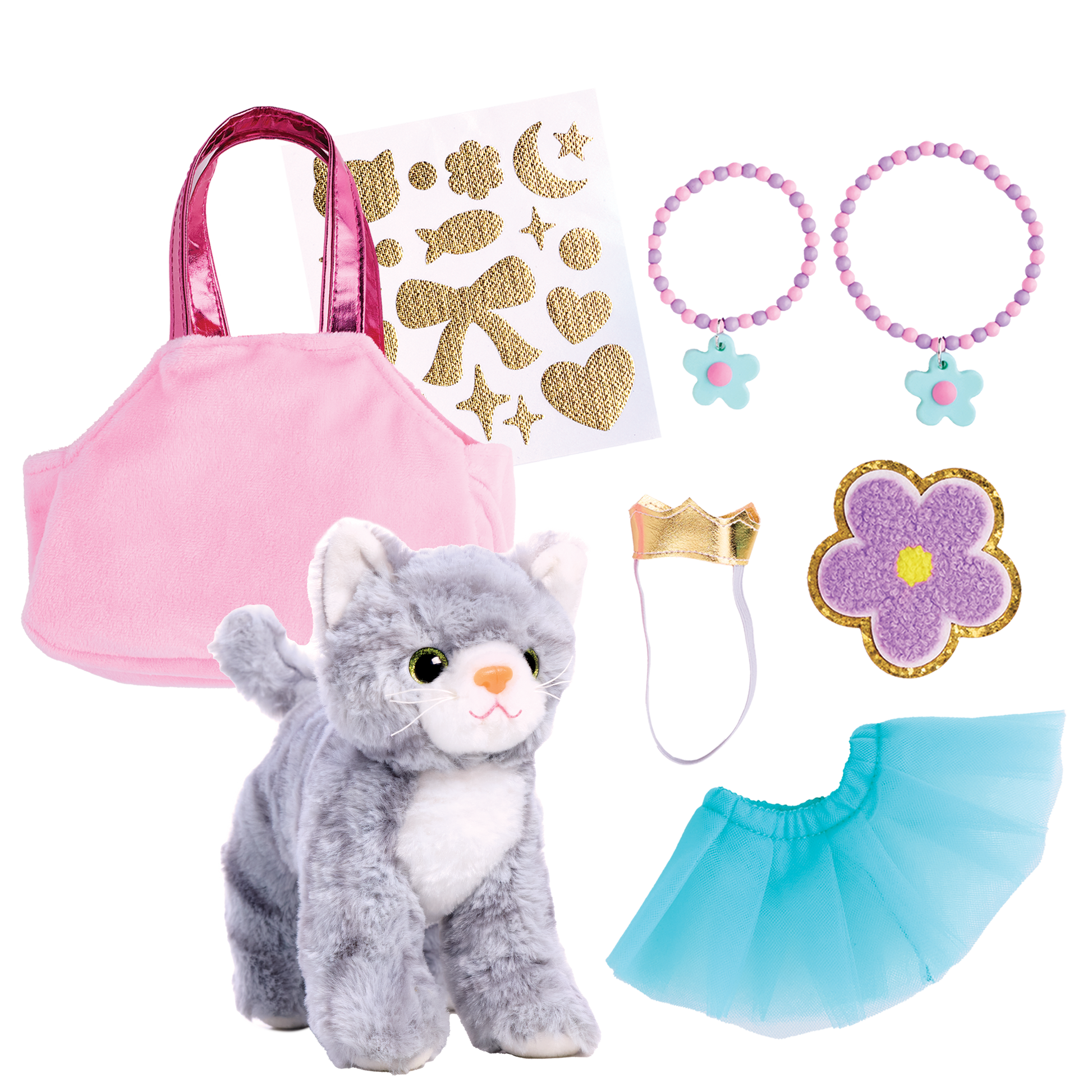 This cuddly kitten will be your purr-fect crafting companion. Decorate this plush kitten and velvety pet carrier with an array of adorable accessories including: ribbon and bell collar, metallic gold stickers, unicorn horn and shiny butterfly wings. No glue, no mess!