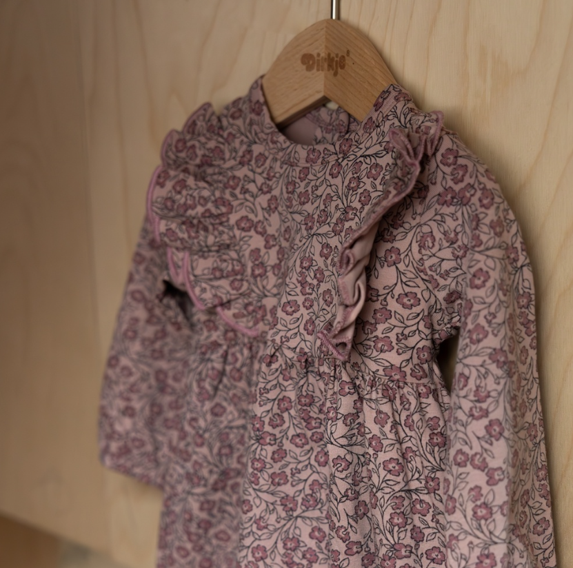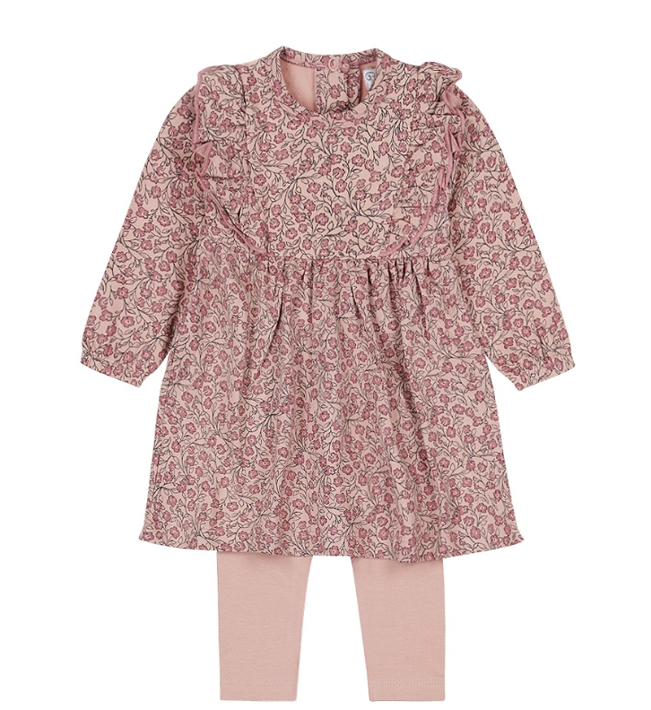 An adorable set for your little one! This Dirkje baby set consists of a soft pink girls dress with a sweet floral print and playful ruffles on the front. The handy snaps on the back make putting on and taking off extra easy. The matching leggings in soft pink complete the outfit. Both items are made of cotton with stretch, so your baby can move freely throughout the day.