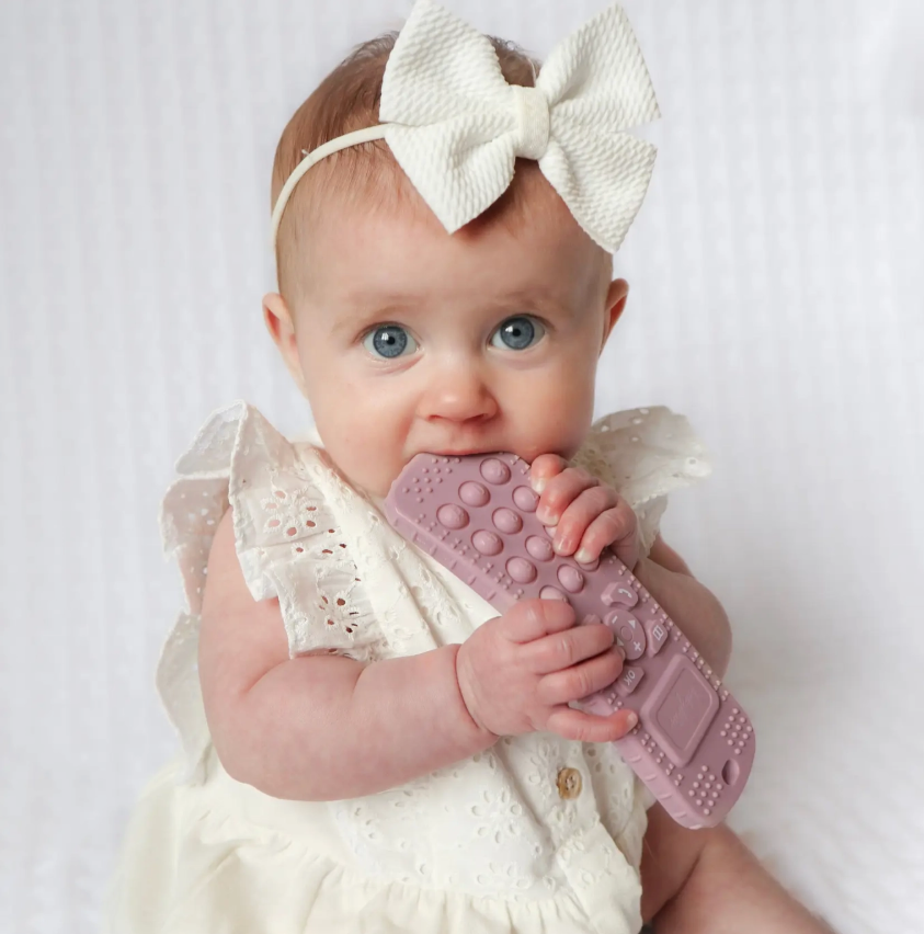 The Baby Bliss Teether Phone is inspired by mobile phones and TV remotes; but instead, baby style! Made with 100% premium food grade silicone. Free of BPA, PVC, Phthalates and Lead. Featuring soft, safe silicone and fun buttons to push that pop in-and-out. Making this a teether and toy — all in one. The safety of little one's is our main priority. All Baby Bliss infant products are tested under the Canada Consumer Product Safety Act (CCPSA) and The Consumer Product Safety Improvement Act (CPSIA).