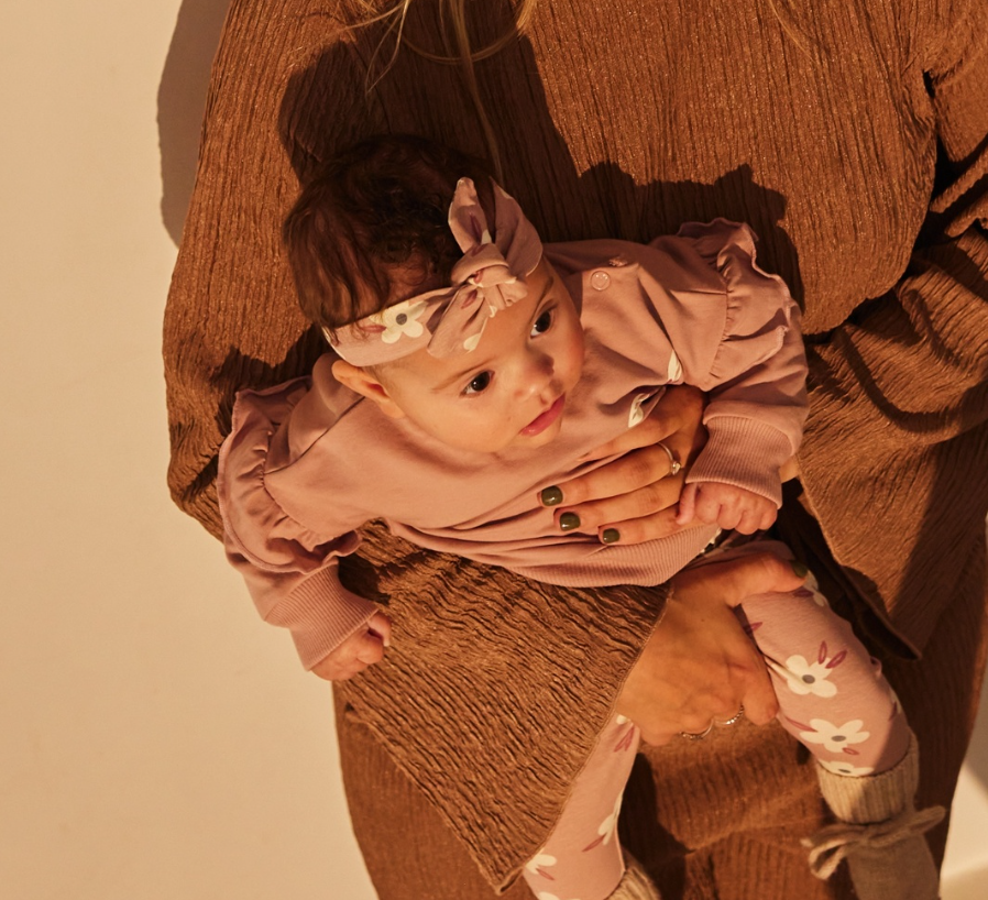 A complete set for an adorable look! This Dirkje set consists of a soft pink sweater made of cotton with stretch, with a sweet little flower on the front and playful ruffles over the shoulders. The snap buttons on the shoulder make dressing extra easy. The matching leggings with sweet floral print are comfortable because of the soft cotton with stretch. Complete the outfit with the cute soft pink hairband with bow. Perfect for a cozy day!