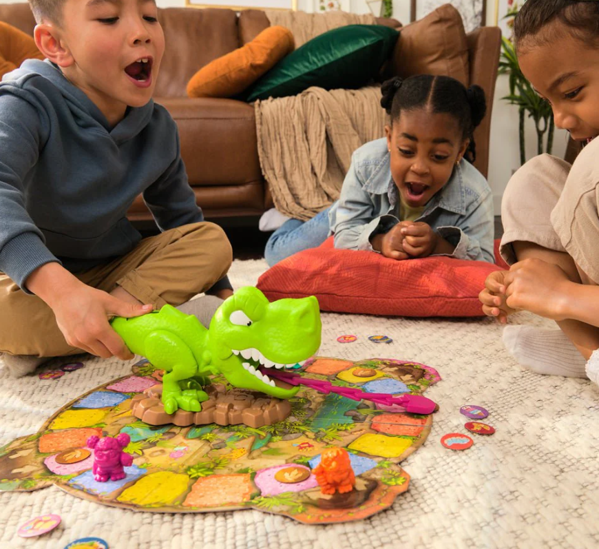 You better run from the dino tongue! Help hungry cavepeople - Ogg, Bogg, Grogg, and Shirley - hunt for food while avoiding the legendary Snack-O-Saurus Rex! As a snack-loving dino, he'll grab extra grub when you launch his super-long tongue. But be careful: you might lose some snacks when his tongue hits you! Players can aim the dino to snatch a snack or work with the t-rex by aiming at an opponent to knock them back.