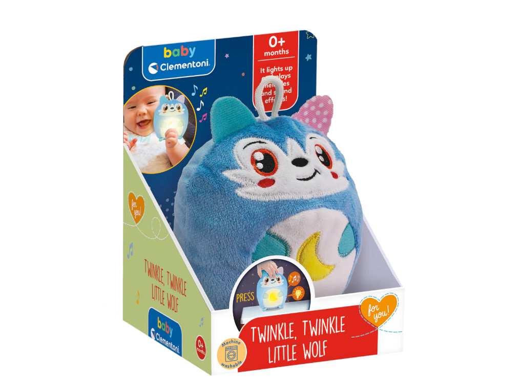 This tender little wolf is a night light and a plush toy that helps the child to relax and gradually fall asleep. All the characters of the Twinkle Twinkle range light up as they activate relaxing melodies and white noises studied to help the child fall asleep. The warm light creates a more pleasant environment for the child, while the sounds and melodies aid relaxation. A toy suitable for newborns but also for babies aged 6 months or older in the transition phase to sleep autonomy. The toy can be machine washed after removing the electronic module. Discover all the characters of the Baby Clementoni for you Twinkle Twinkle range: Little Sheep, Little Wolf, Little Fox and Little Badger.