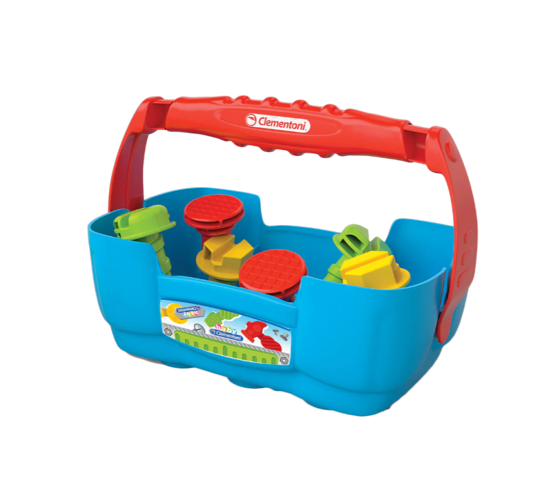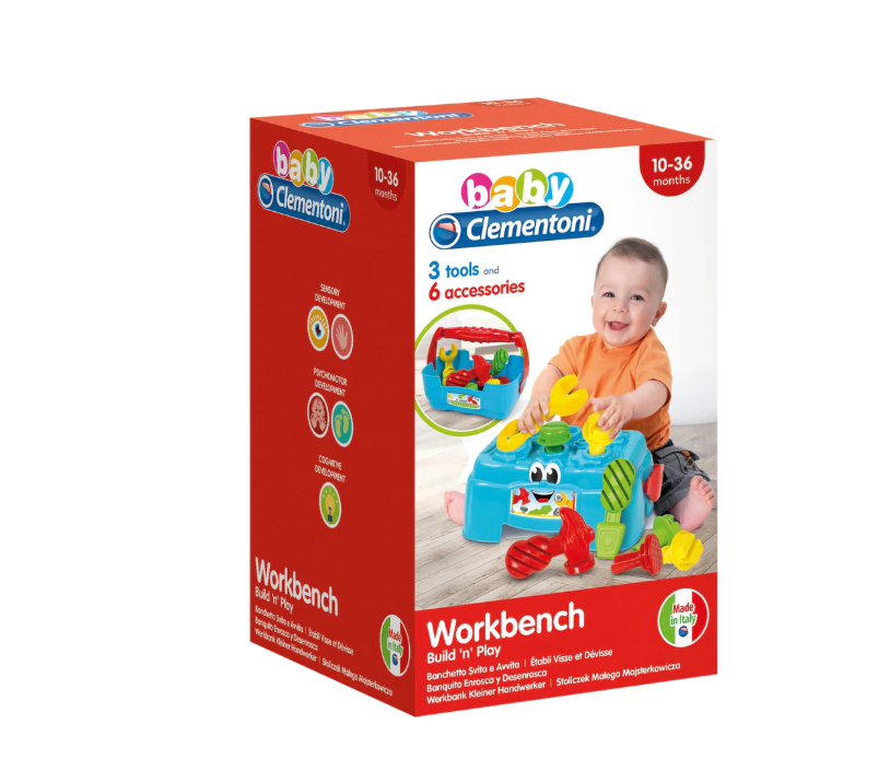 Baby will be delighted to discover this bright work table with 3 tools (hammer, screwdriver, wrench) and 6 accessories (nails, bolts, screws). There is even a handle for carry-along building fun. Great for eye-hand coordination and manual skills.