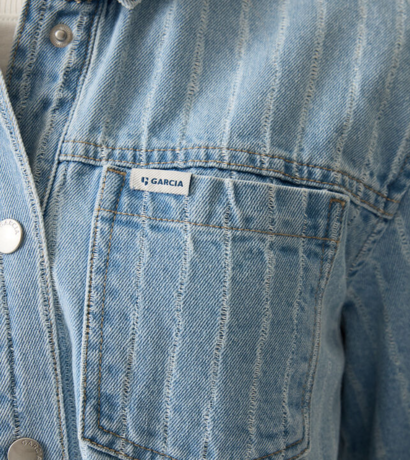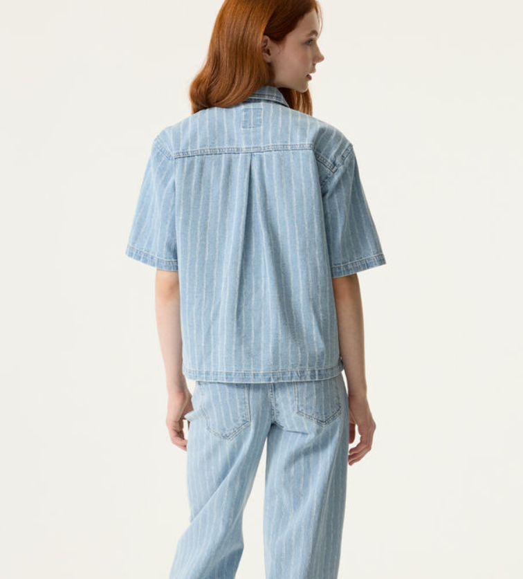 Cropped denim blouse with needle punch. This blouse features a classic collar, short sleeves, a snap button closure, and a generous fit. This item is made of 100% cotton.
